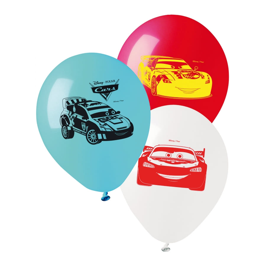 Ces ballons multicolores (bleus, blancs et rouges) possèdent chacun un imprimé d'une voiture représentant un personnage du Disney "Cars".