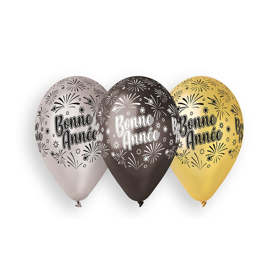 Chaque ballon possède l'inscription "Bonne Année" en blanc sur le coloris noir et en noir sur les fond argenté et doré.