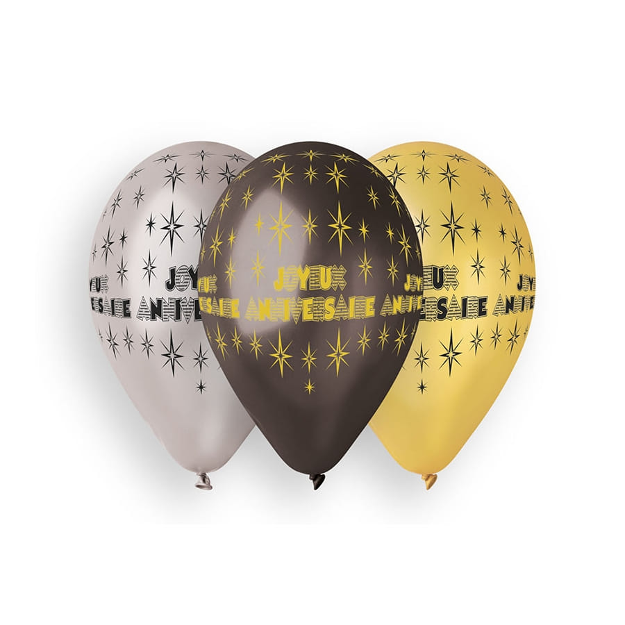 Chaque ballon est imprimé de la mention "Joyeux Anniversaire", avec des étincelles tout autour.