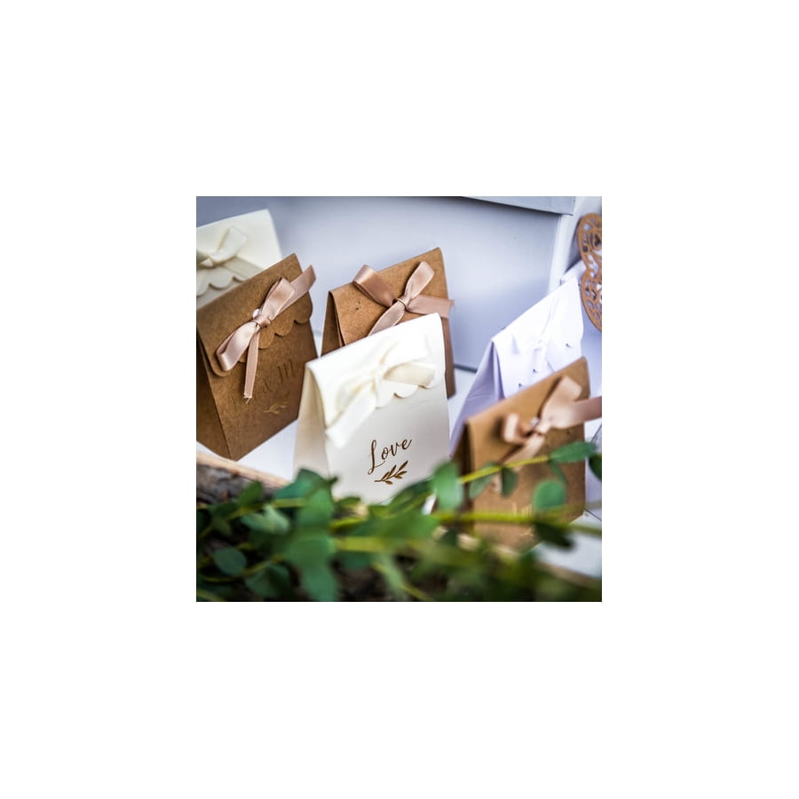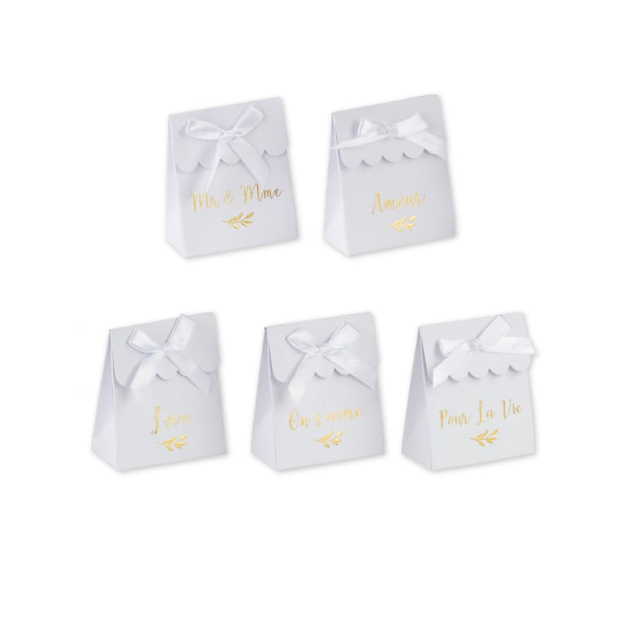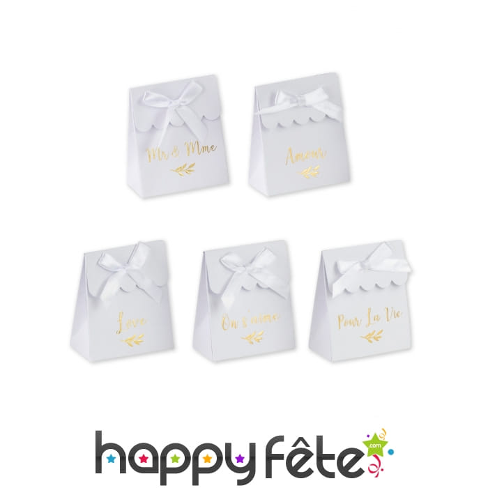 Ces boites fabriquées en carton mesurent 7 x 8,5 cm et sont habillées d'un magnifique ruban satiné blanc.