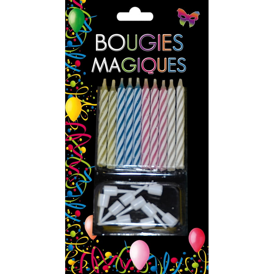 Il vous faut absolument vous procurer ces bougies spéciales ! Ce ne sont pas des bougies d'anniversaire ordinaires, elles sont magiques. En fait, elles ne s'éteignent pas lorsqu'on les souffle, sauf si on les met dans l'eau. Vous pouvez donc piéger vos amis en les mélangeant à de vraies bougies, n'oubliez pas de tout filmer ! Ces belles bougies de couleur bleue, jaune et rouge, sont vendues dans un paquet de 10 avec leurs bobèches de couleur blanche.