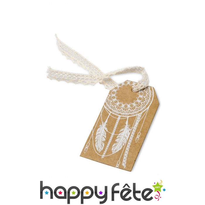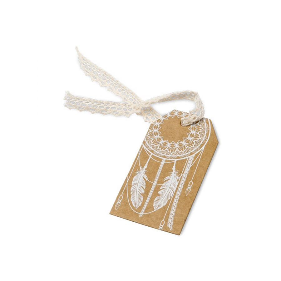 Ces dix étiquettes beige en carton mesurant 8,5 x 5 cm sont ornées d'un capteur de rêves imprimé en blanc sur l'avant.