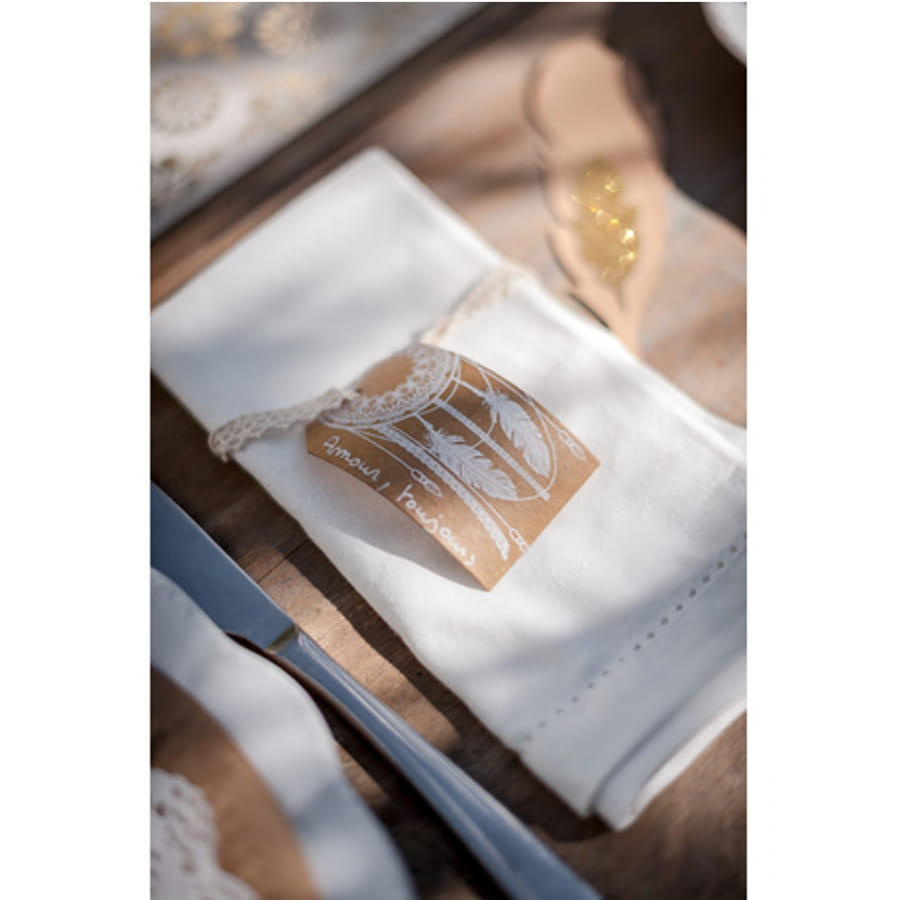 Apportez une touche personnelle à la décoration pour un mariage sur le thème Western grâce aux 10 étiquettes Kraft imprimé plumes blanches.
