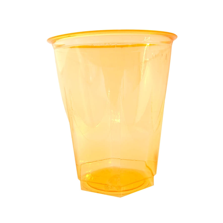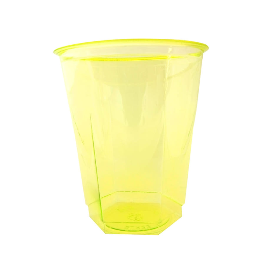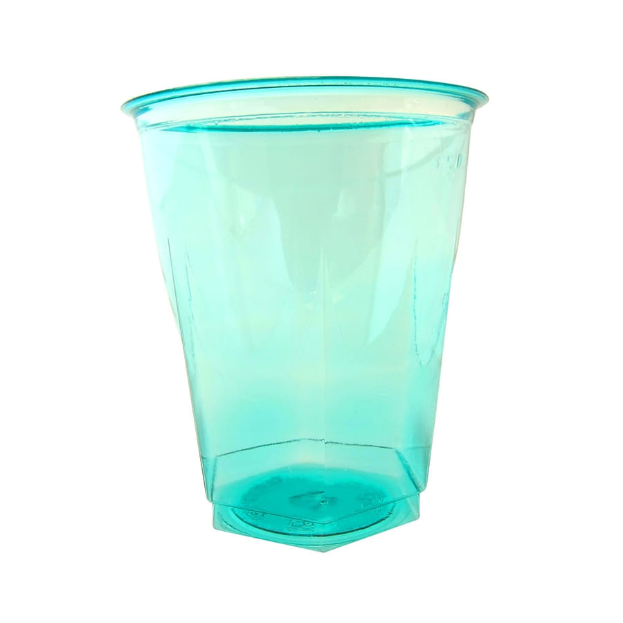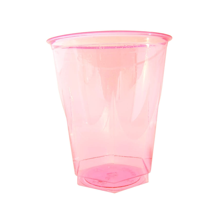 Chaque gobelet est en plastique transparent, et peut être fourni en plusieurs couleurs au choix: fuchsia, turquoise, anis et mandarine.