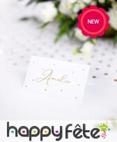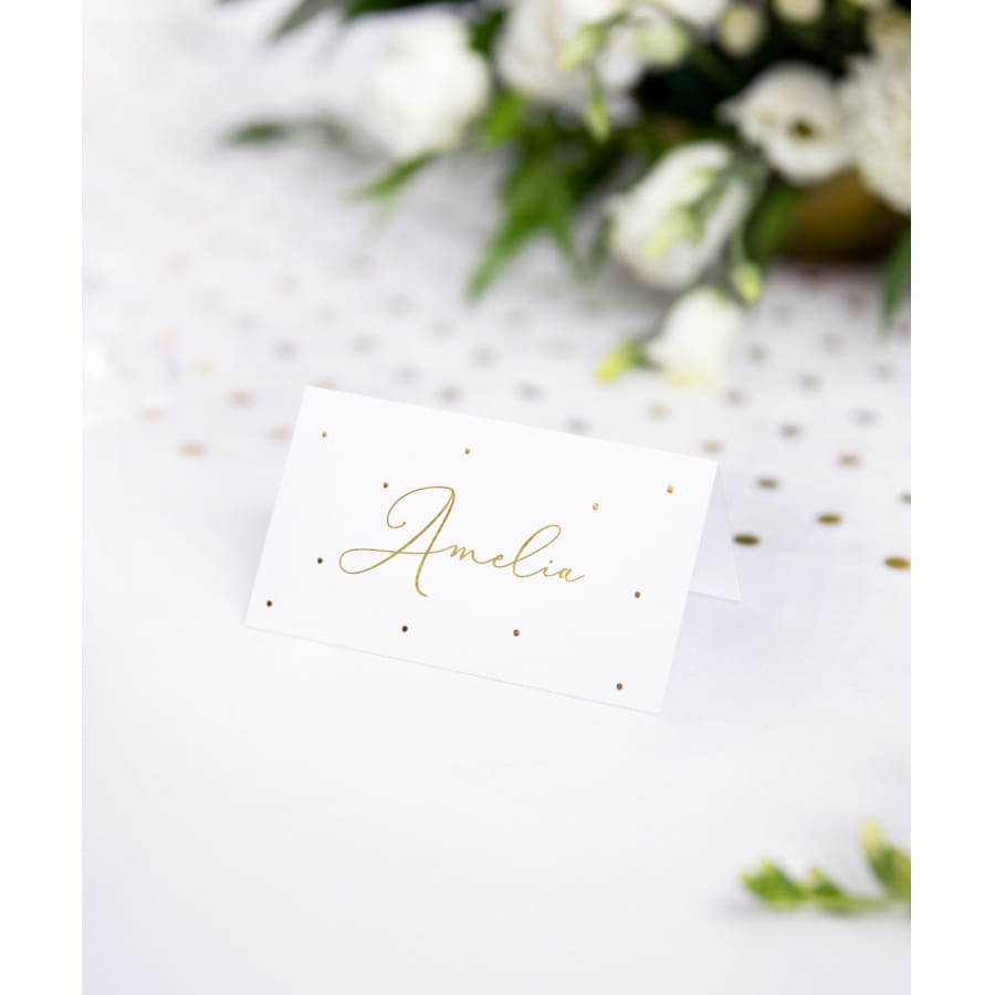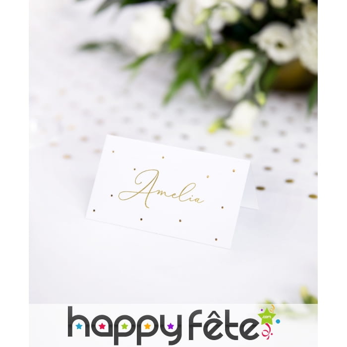 Chaque marque-place mesure 9,5 x 5,5 cm et présente des motifs à pois dorés sur fond blanc.