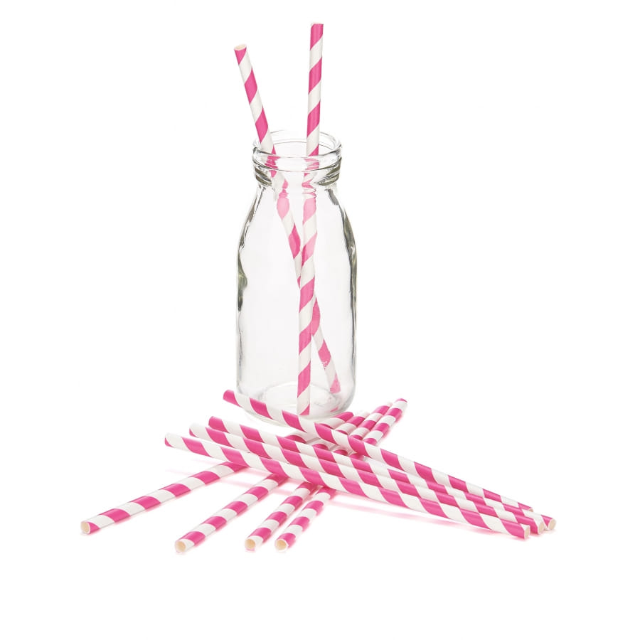 Les 10 pailles rayées fuchsia de 19,5 cm sont en carton.