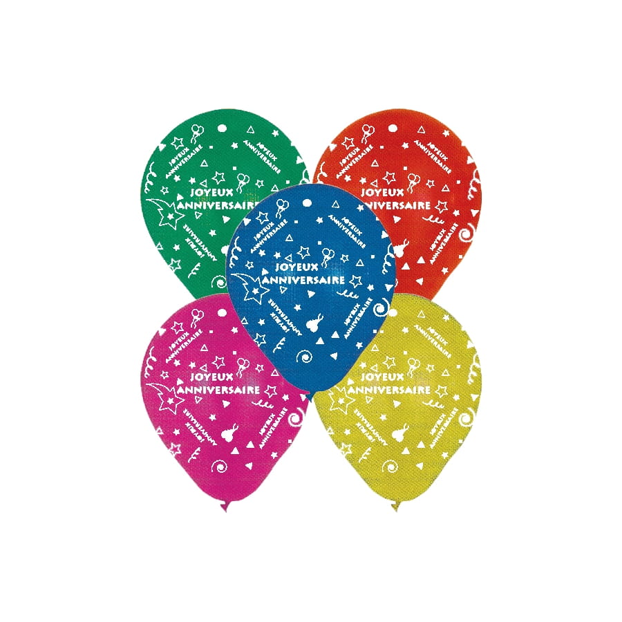 Ballons multicolores imprimé d'un "Joyeux Anniversaire" en blanc. Ces ballons sont vendus en lot de 100, sont biodégradables et gonflables à air ou hélium. Ils mesurent 30 centimètres de diamètre et 105 centimètres de circonférence. Ils sont parfaits pour un anniversaire.