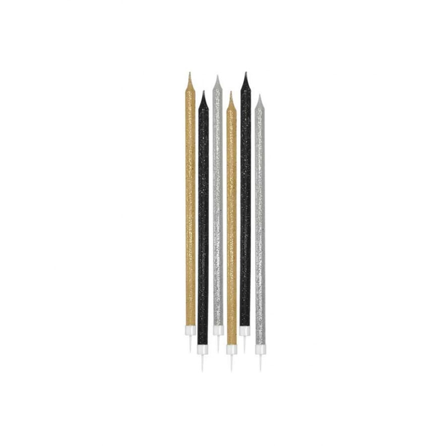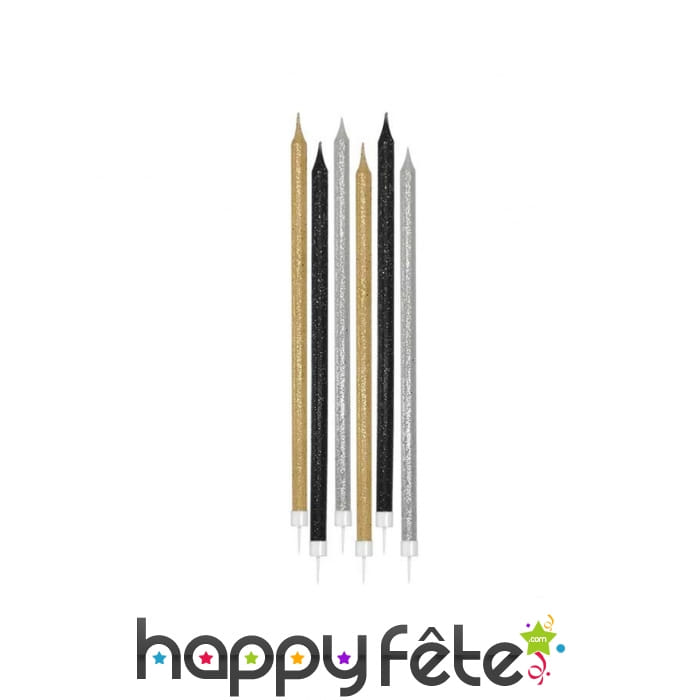 Mettez une touche de brillance à la déco de votre gâteau d'anniversaire, avec les 12 bougies grises or et noires pailletées de 15 cm.