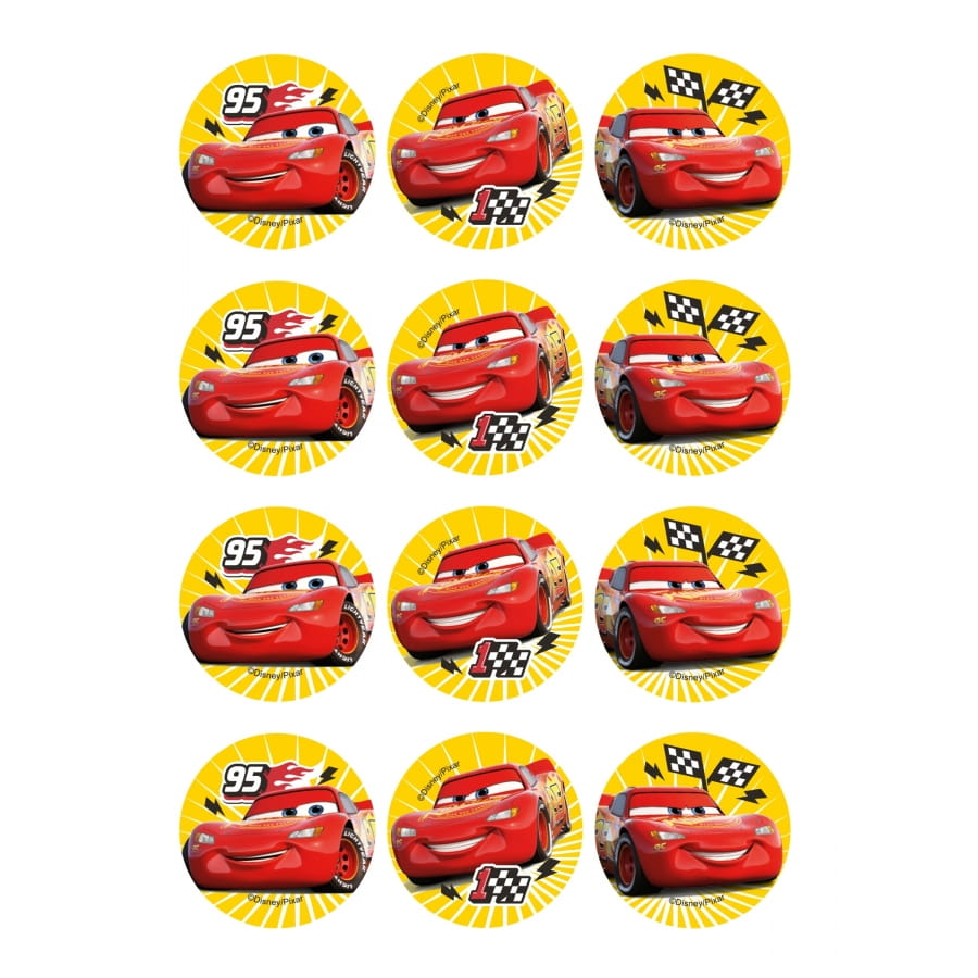 Nous décrivons ici les 12 décos pour biscuits Cars de 6cm en amidon.
