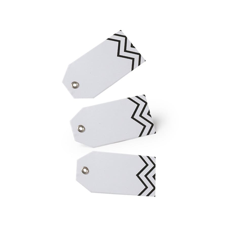 Les 12 étiquettes motif chevron blanc et noir sont des décorations de 6 x 3 cm.