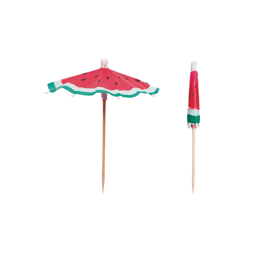 Les 12 parapluies à cocktail imprimé pastèque de 10 cm sont munis de piques en bois.