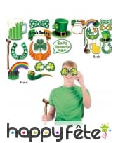 Vous trouverez divers accessoires festifs parmi lesquels des lunettes en forme de trèfle, une pipe, une barbe de leprechaun, un haut de forme, une chope de bière verte ou encore une boite de dialogue avec les mots "kiss my shamrocks".