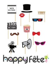 Découvrez dans ce kit une caméra, un clap de cinéma, un noeud papillon, une bouche, 2 lunettes, des pop-corn, un haut-parleur, une moustache, un ticket de cinéma, une bande du film et un chapeau.