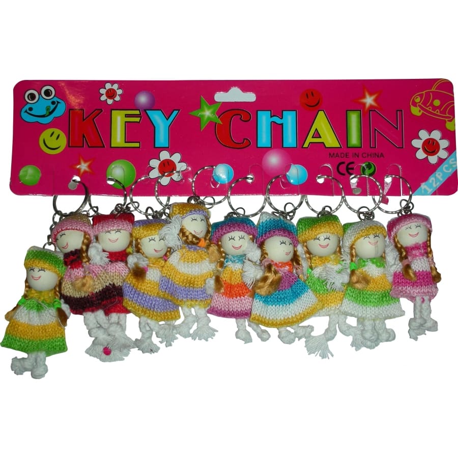 Lot de 12 porte-clefs en forme de petite poupée multicolore en bois et en laine. Chacune des poupées mesure 7 centimètres de long. Elles sont chacunes différentes des autres. Vous pouvez les distribuer aux petites filles lors d'une kermesse.