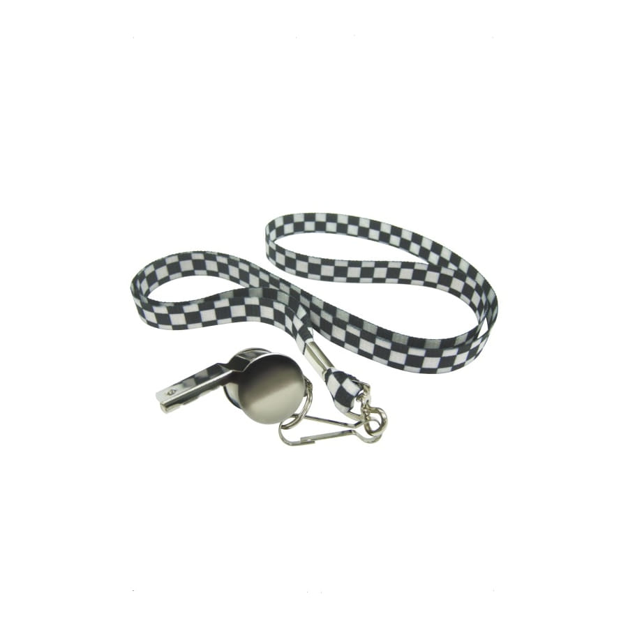 Sifflet en métal avec long cordon à carreaux blancs et noirs (vendu par 12). Ce sifflet sera utile pour une kermesse où vous devrez donner des directives ou pour un rôle d'entraîneur ou de juge lors d'une compétition sportive.