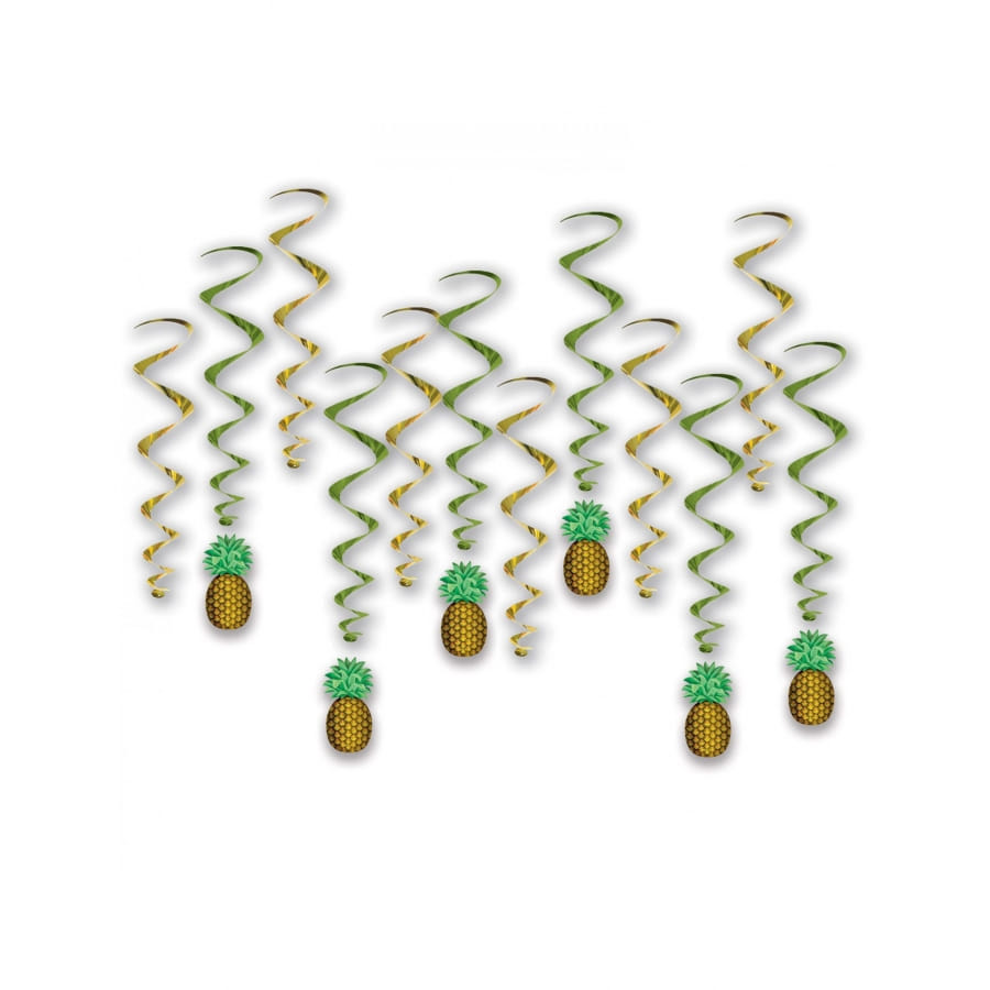 Ces suspensions comportent: 6 en forme de spirales dorées mesurant chacune 43 cm de long, 6 autres spirales vertes de 86 cm ornées chacune d'un petit ananas.
