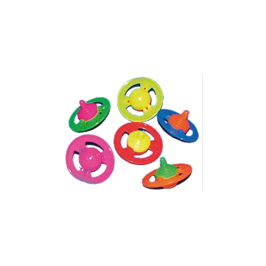 Sachet contenant un assortiment de 12 toupies soucoupes multicolores. Chacune des toupies mesure 4 centimètres de diamètre. Vos enfants pourront organiser des batailles de toupies!