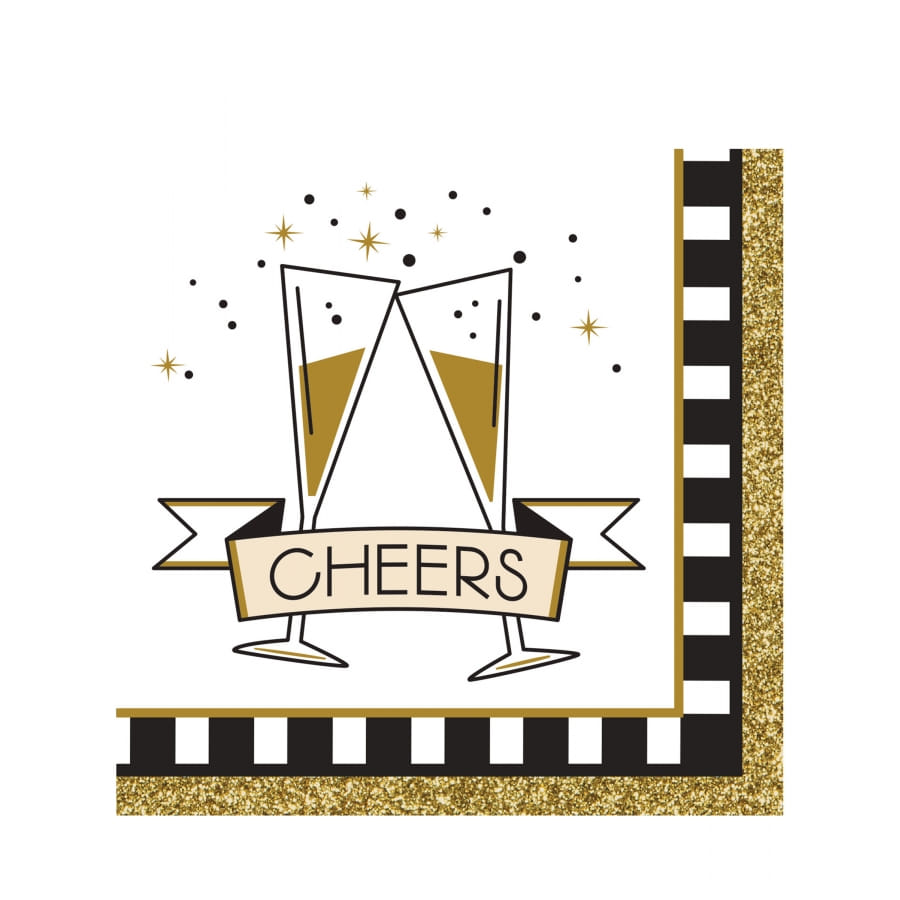 Ces 16 petites serviettes sont imprimées de l'inscription cheers de couleur noir et or.
