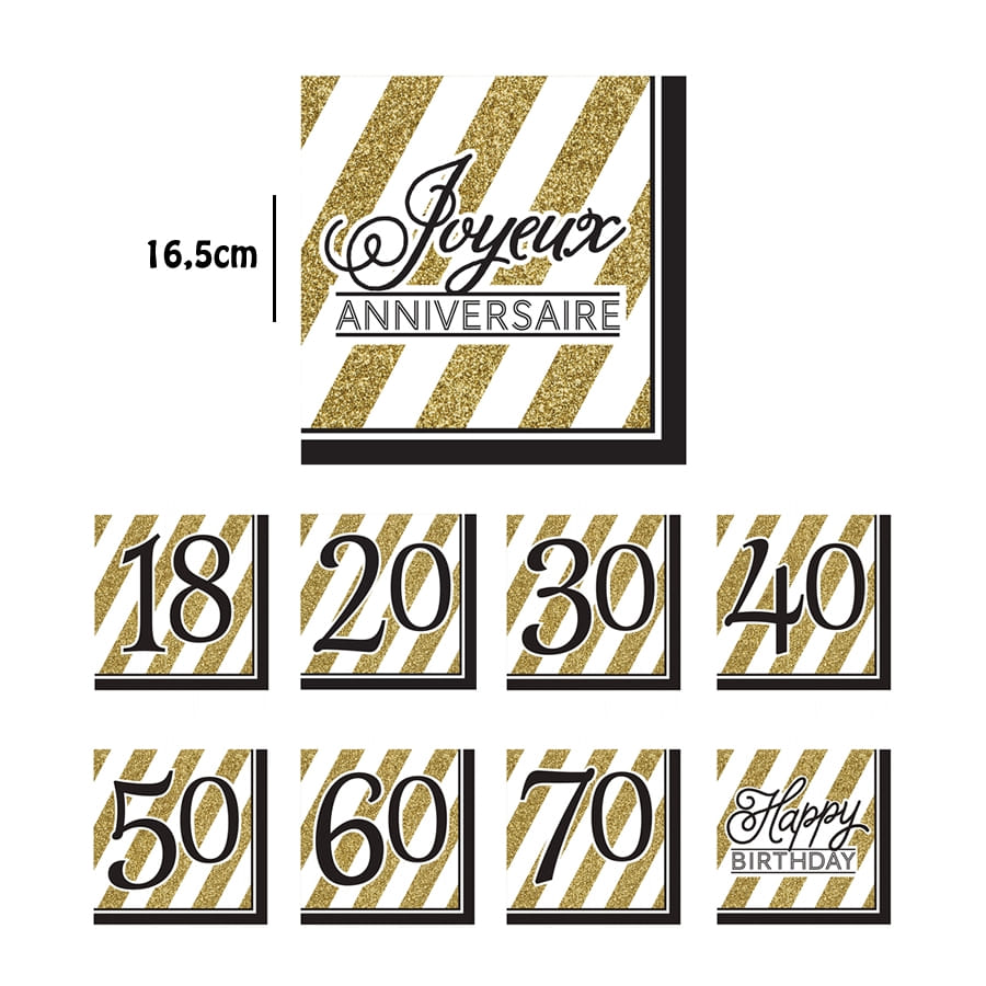Pour votre prochain anniversaire, offrez à vos invités une table élégante et glamour, décorée de nos 16 serviettes d'anniversaire noir et or.