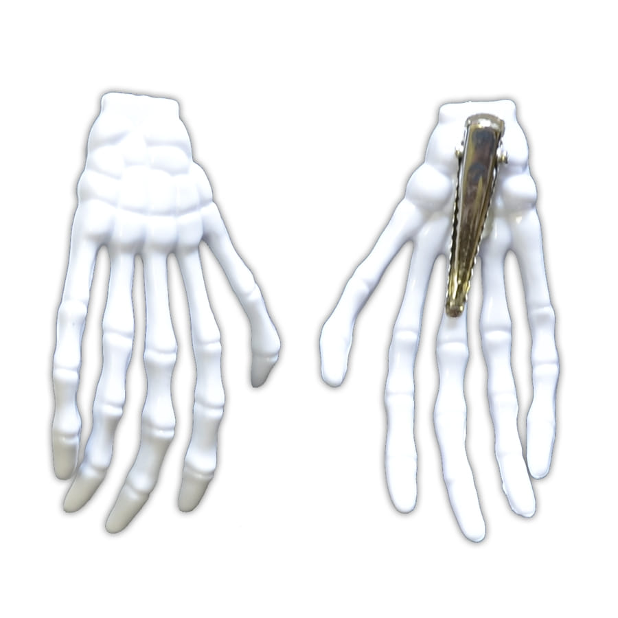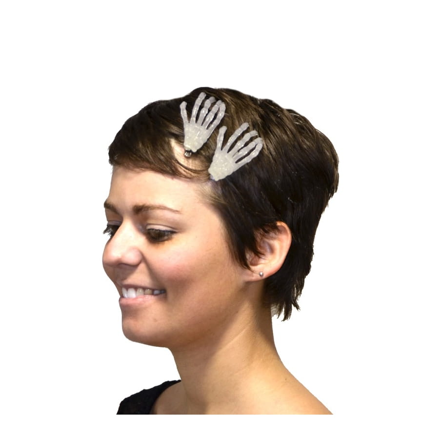 Set contenant 2 barrettes à cheveux en forme de mains de squelettes. Ces petits accessoires sont montés sur des clips qui les dissimulent parfaitement, donnant l'impression que vous avez réellement des mains dans les cheveux. Elles vous iront très bien à l'occasion Halloween ou pour un style gothique ou punk.