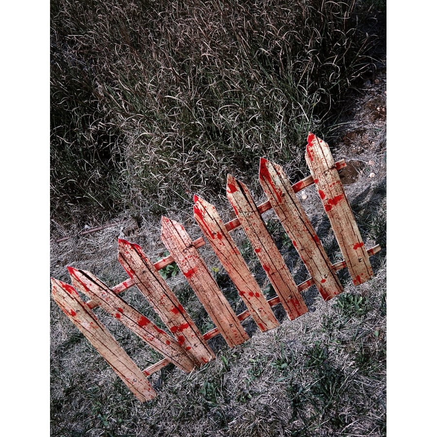 Elle est faite de piliers pointus au sommet sur lesquels sont imprimés des motifs bois tachés de sang au recto et blancs au verso.