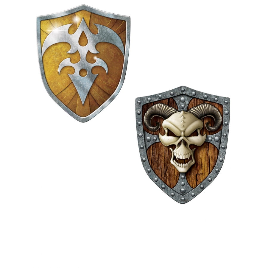 Les 2 boucliers décoratifs mesurant 48 cm sont en carton.