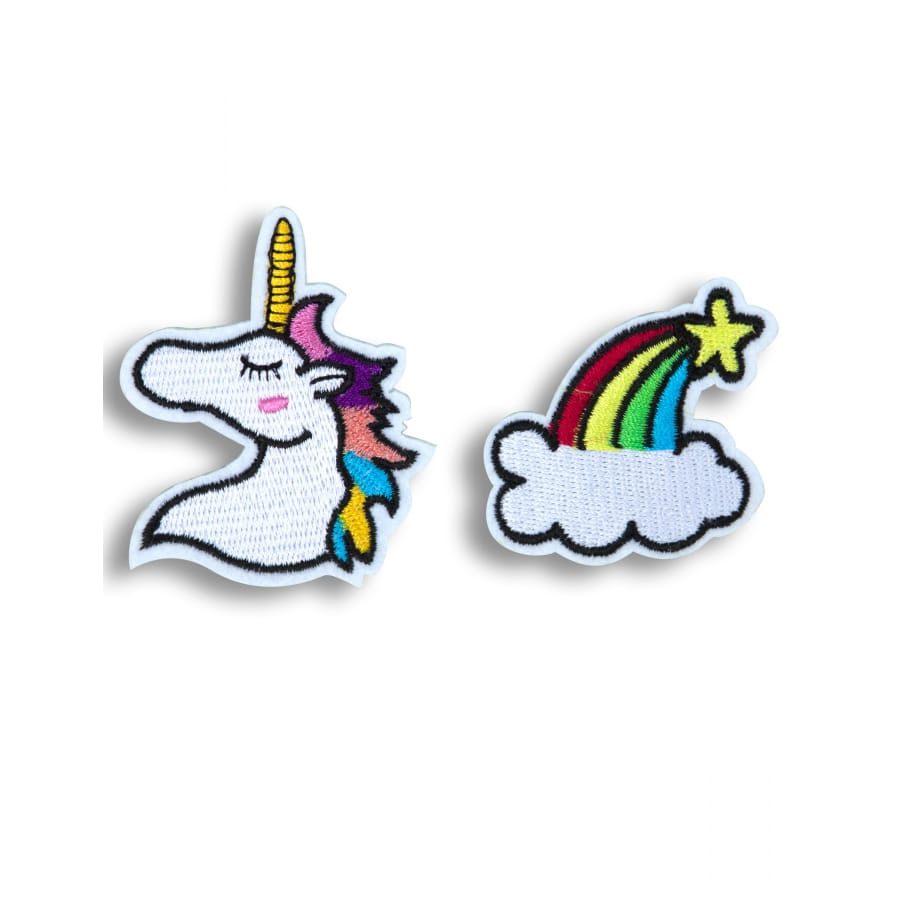 L'une des broches représente une licorne blanche avec une crinière multicolore de 6,7 cm tandis que l'autre broche est un nuage avec arc-en-ciel et étoile jaune de 5 cm.