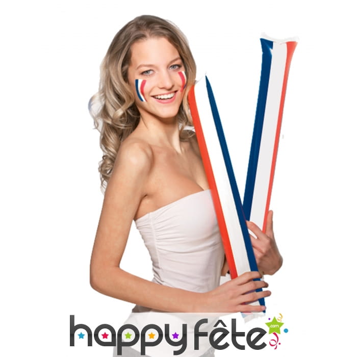 Ces clap clap en forme de gourdins sont gonflables, et présentent les couleurs du drapeau français: bleu blanc rouge.