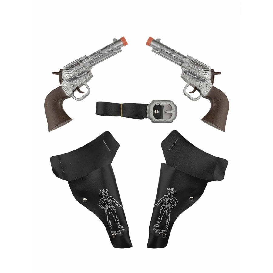 Le kit de 2 pistolets enfant avec holster et ceinture est un ensemble d'accessoires de cowboy en plastique.