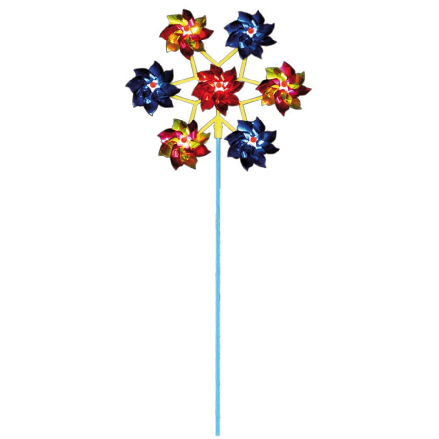 Moulins à vent avec 7 fleurs, de couleur bleue, jaune et rouge, vendus en lot de 24. Chacun des moulins mesure 26 centimètres de hauteur sur un diamètre de 29 centimètres. Installez ces moulins un peu partout chez vous à l'occasion d'un anniversaire pour créér une ambiance magique.