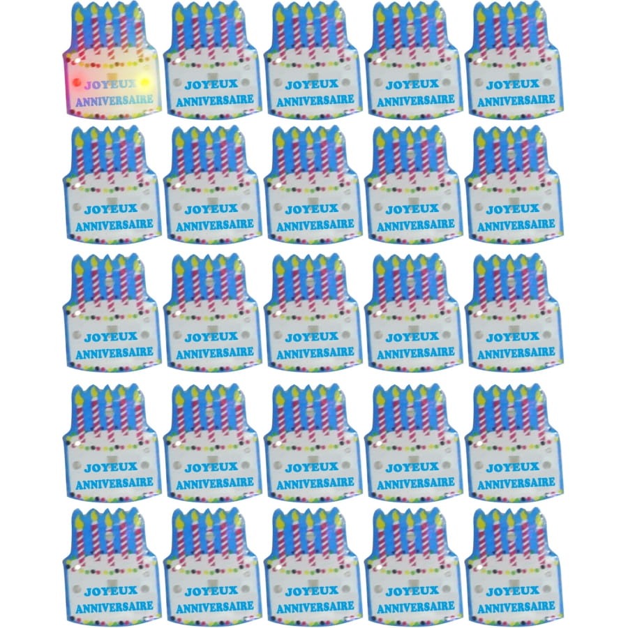 Pins en forme de gâteaux d'anniversaire multicolores, vendus en lot de 25 et avec les piles. Epinglez ces pins sur les vêtements des enfants présents à l'anniversaire de votre enfant.