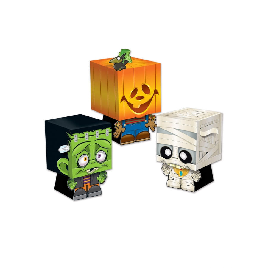 Il s'agit de petites figurines avec des têtes carrées illustrant Frankenstein, une momie et une citrouille.