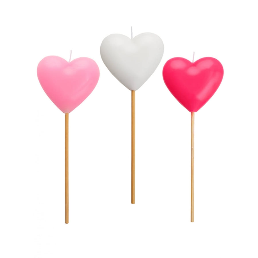 Les 3 bougies en forme de coeur rose et blanc de 20 cm sont montées sur des tiges.