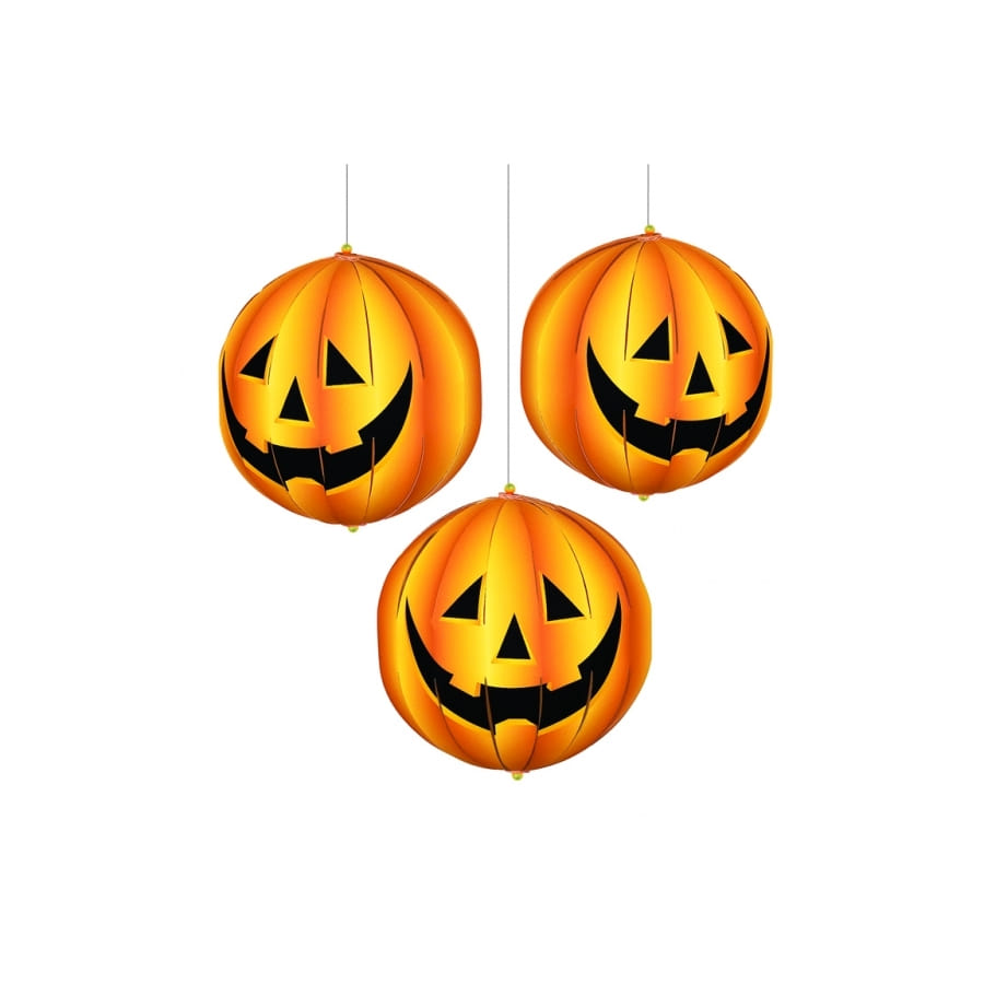 Finalisez votre décoration à l'occasion d'halloween grâce à ce pack de 3 citrouilles souriantes à suspendre de 15cm.