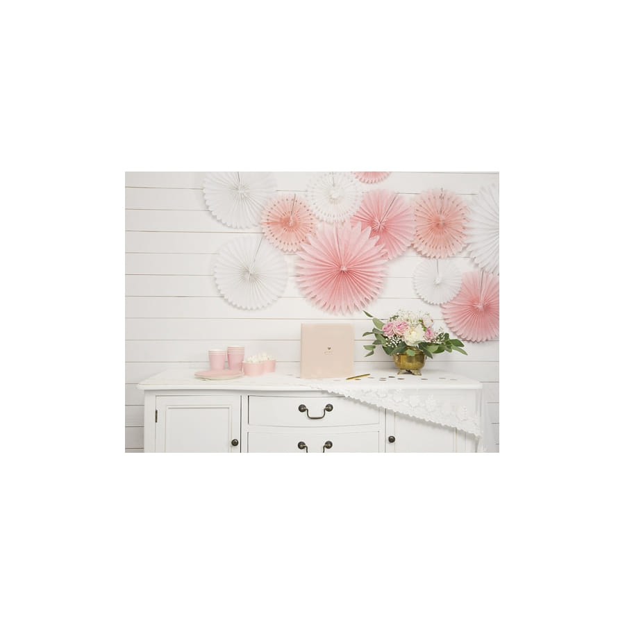 Il s'agit d'éventails livrés par lot de 3 et qui seront à suspendre pour créer une ambiance pleine d'originalité et de style. Les 3 rosaces qui mesurent respectivement 30, 25 et 20 cm seront parfaites pour habiller une décoration de Noël, d'anniversaire ou de Saint Valentin.