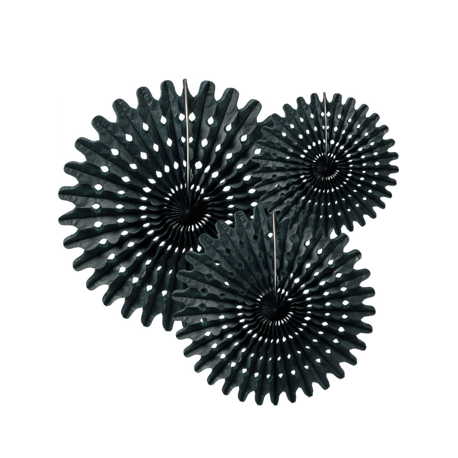 Les 3 rosaces éventails noires en papier sont des décoratifs à suspendre à l'aide d'une cordelette.