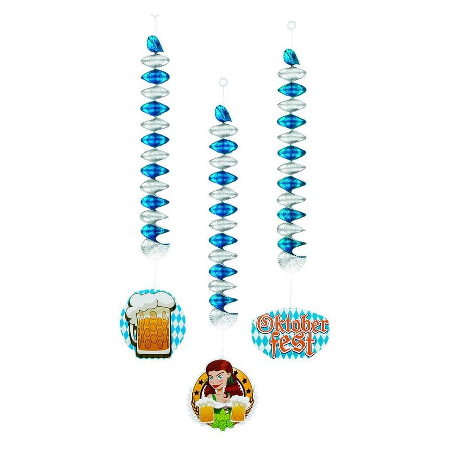 Il est question d'un lot de 3 disques à suspendre, sur lesquels on retrouve l'image d'une serveuse, d'une chope de bière et d'une inscription (Oktoberfest) sur un fond avec imprimés de losanges bleus et blancs. Les disques sont en carton et disposent d'une base en spirale métallisée.