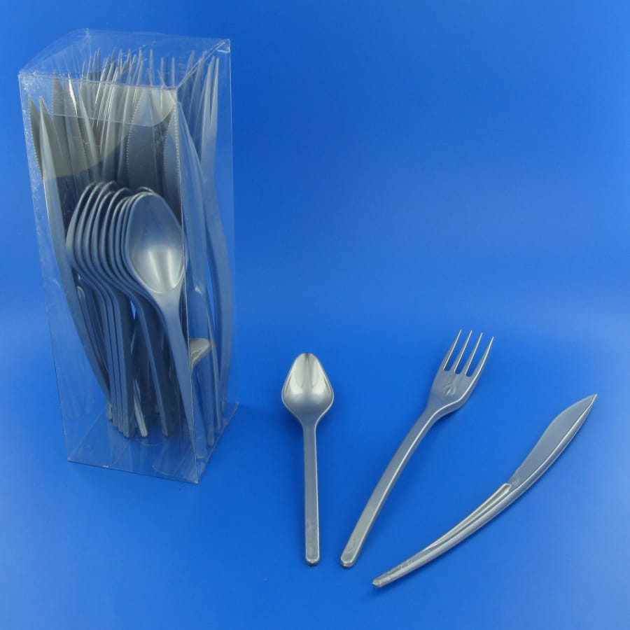Set de 30 couverts en plastique de couleur grise , composé de 10 couteaux, de 10 fourchettes et de 10 cuillères. Choisissez ce set pour une couleur de couvert sobre et intéressant à la fois.