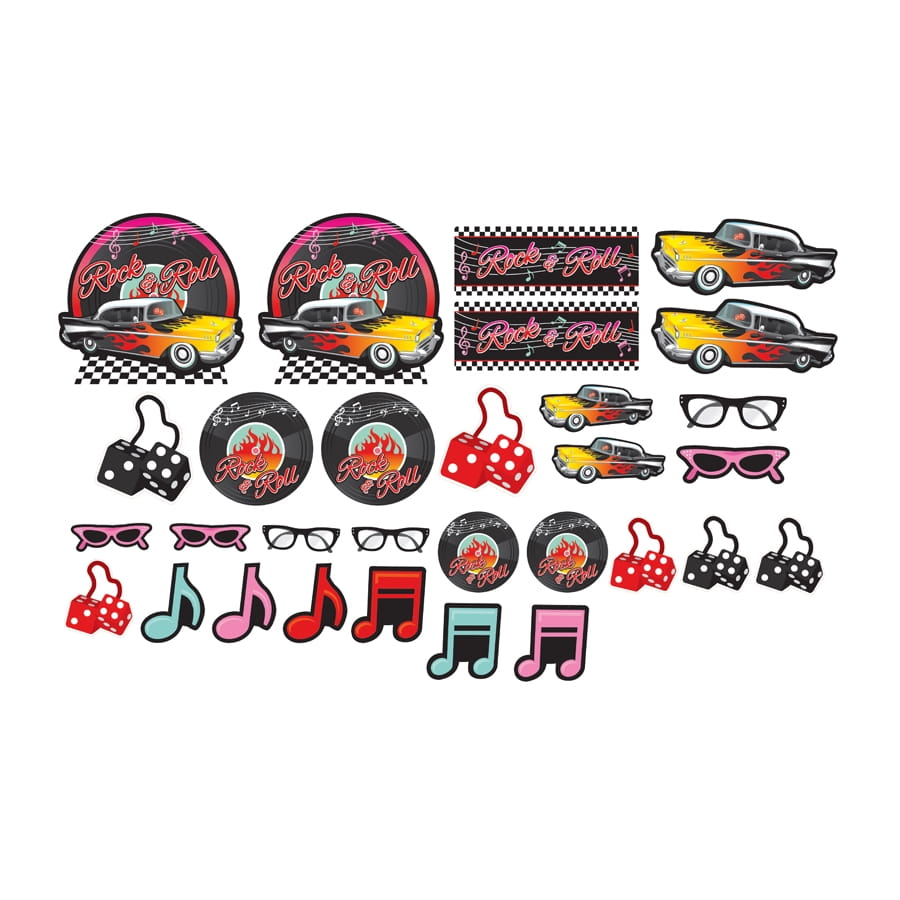 Découvrez une panoplie d'articles décoratifs axés sur le thème rock'n roll. Un lot de 30 décorations rock'n roll à accrocher vous est suggéré pour célébrer la fête de la musique ou pour organiser une réception dans le style années 50-60. Diverses formes avec de multiples coloris constituent le lot. Les accessoires sont catégorisés en trois tailles : 29,2 cm, 17,7 cm et 12,7 cm de dimension.