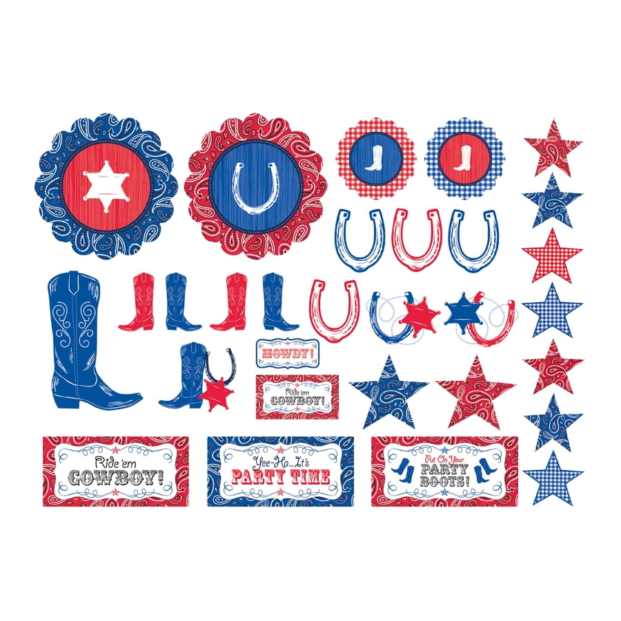 Les éléments décoratifs sur le thème western ne manquent pas. Un assortiment de 30 décorations Western à placer vous est suggéré pour vous emporter au fin fond du Far West. L'article renferme une collection de motifs western dans les couleurs bleu et rouge, mesurant 6 x 29,2 cm, 8 x 17,7 cm et 16 x 12.7 cm.