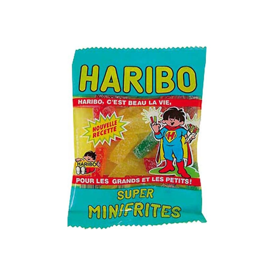 Sachet de bonbons de la marque Haribo contenant 30 Super Minifrites multicolores. Le sachet pèse environ 40 grammes. Il sera très approprié pour un anniversaire d'enfants ou pour une soirée entre amis.