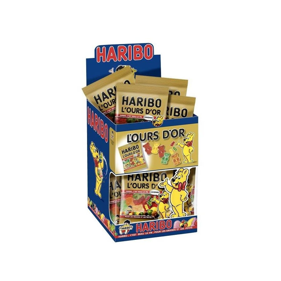 Boîte contenant 30 sachets de bonbons l'Ours d'Or de la marque Haribo. Chacun d'une couleur différente, ces bonbons fruités disparaîtront aussitôt que vous les offrirez à vos invités. Chaque sachet pèse environ 40 grammes.