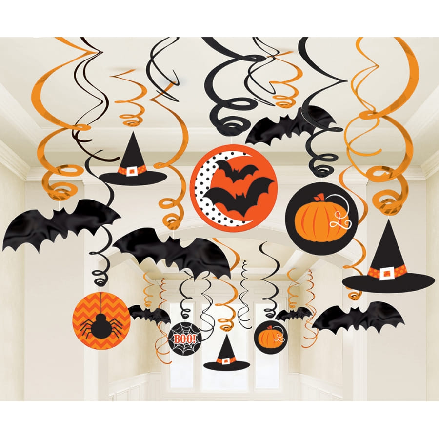 Au bout des tourbillons, vous trouverez des décorations de citrouilles, de chauve-souris, d'araignées, de chapeaux pointus de sorcières, de toiles d'araignée...
