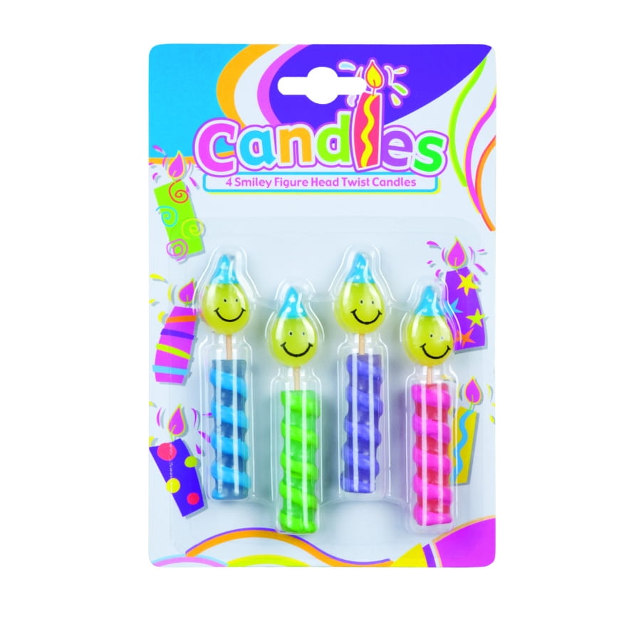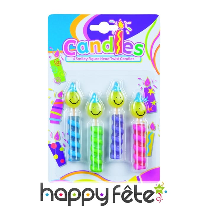 Pour une touche plus fun, cette boîte de 4 bougies sans bobèche en forme de clown tout sourire. Bougies bleue, rose, verte et violette. Ces bougies sont parfaites pour décorer le gâteau d'anniversaire de votre enfant de façon amusante.