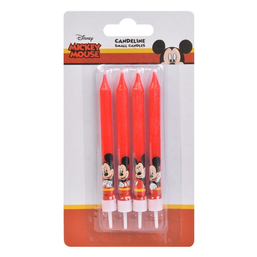 Les 4 bougies de Mickey Mouse de 9 cm pour gâteau sont en cire de couleur rouge.