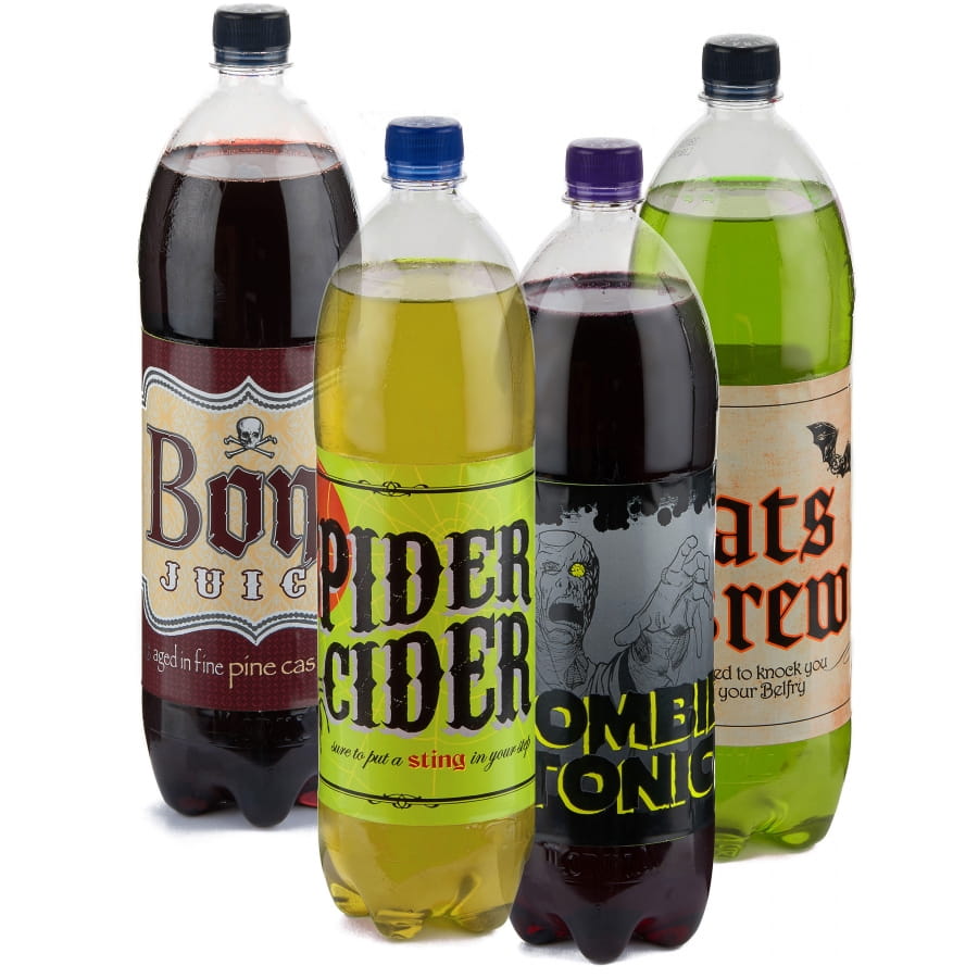 Habillez vos bouteilles de jus suivant le thème de l'événement. Avec ce lot d'étiquettes Halloween pour boissons, recouvrez la marque déposée. L'ensemble comprend 4 modèles différents sous forme d'autocollant prêt à poser. Les inscriptions sur chacune d'entre elles donneront une touche très originale à votre table pendant la soirée, de quoi impressionner vos convives.