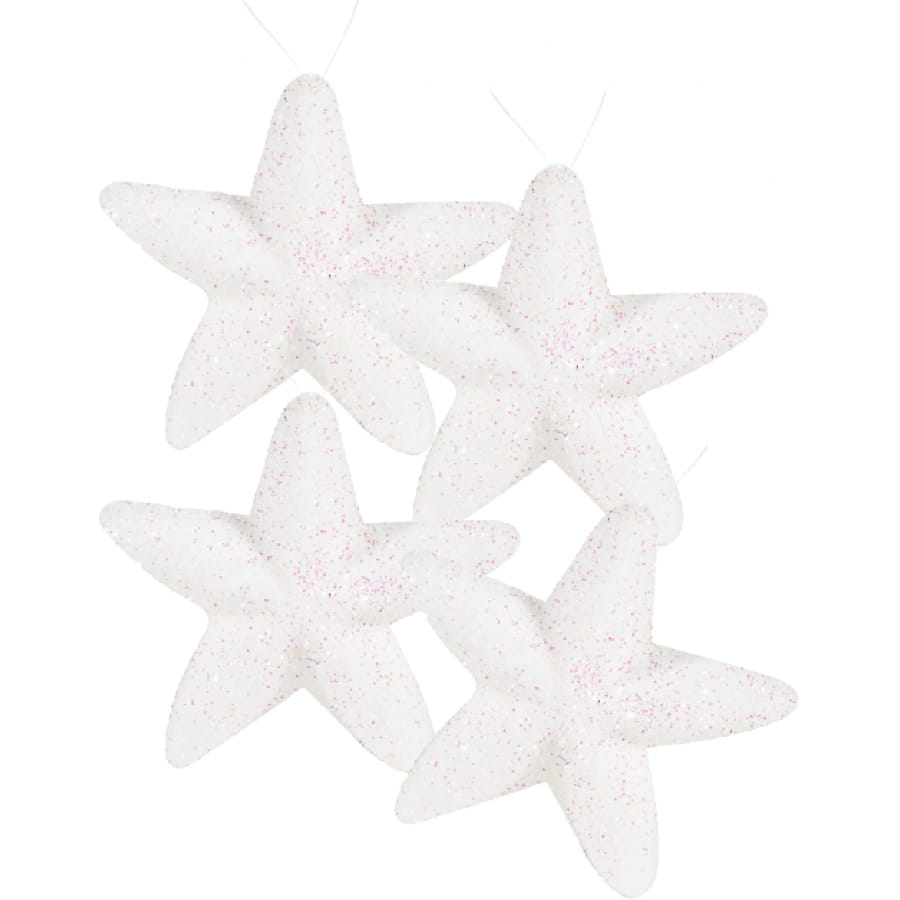 Lot de 4 petites étoiles 'polaires' blanches et recouvertes de paillettes. Chacune des étoiles mesure 10 centimètres. Elles donneront à votre décoration un côté glacial mais féerique.