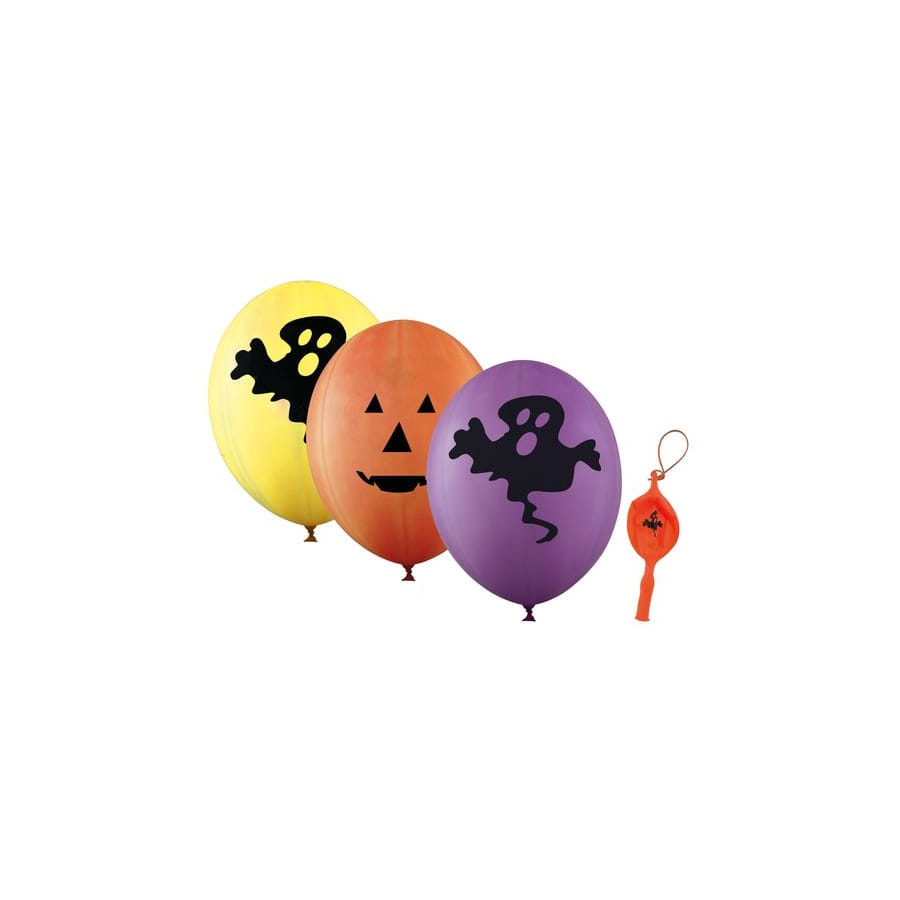 Chaque ballon possède un élastique qui facilite sa suspension, et des motifs tels que des fantômes ou des citrouilles.