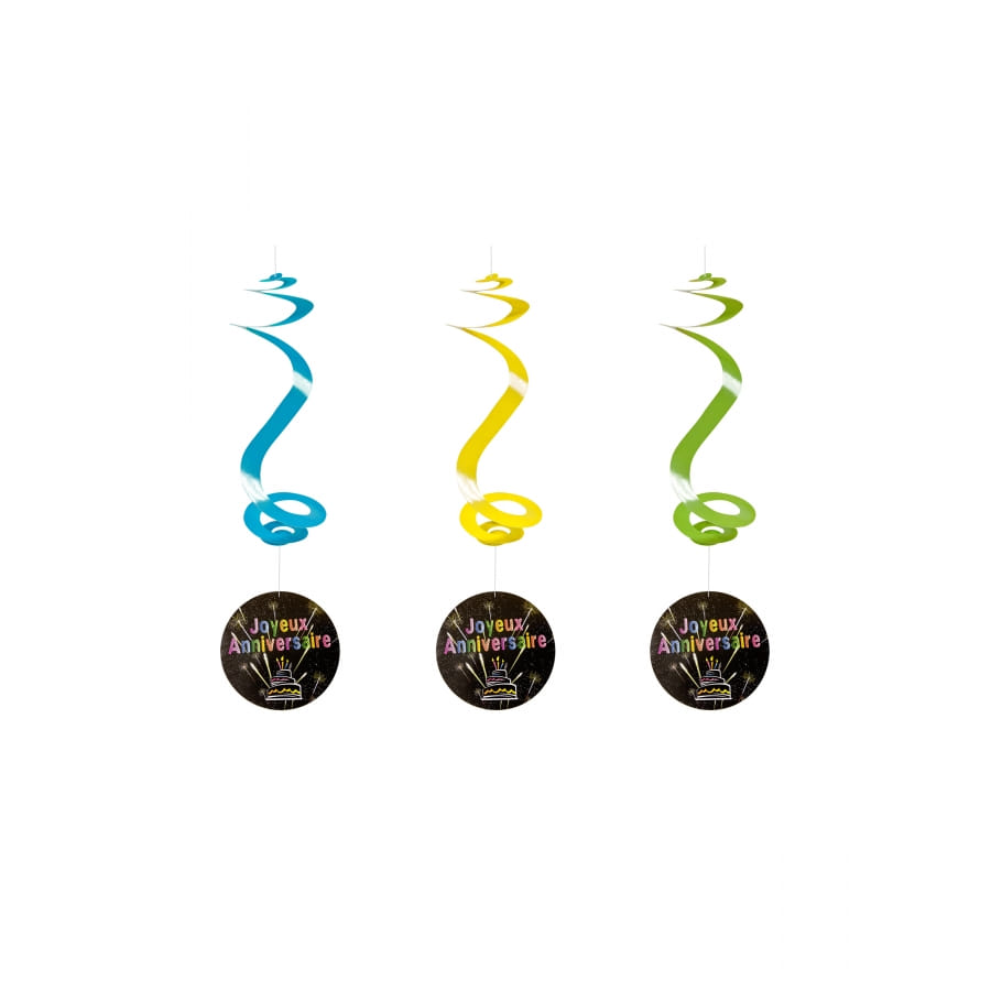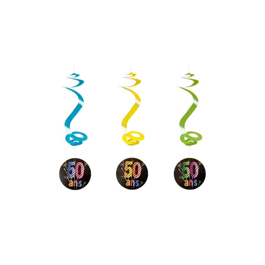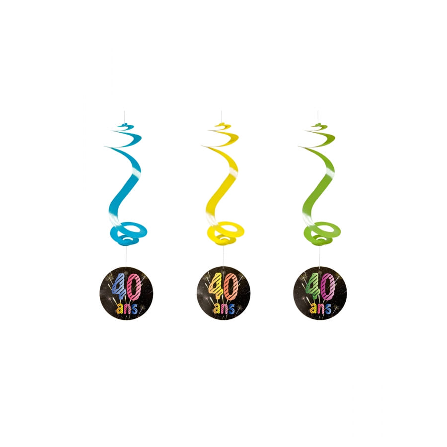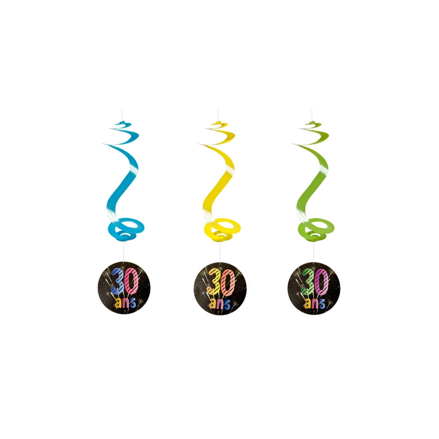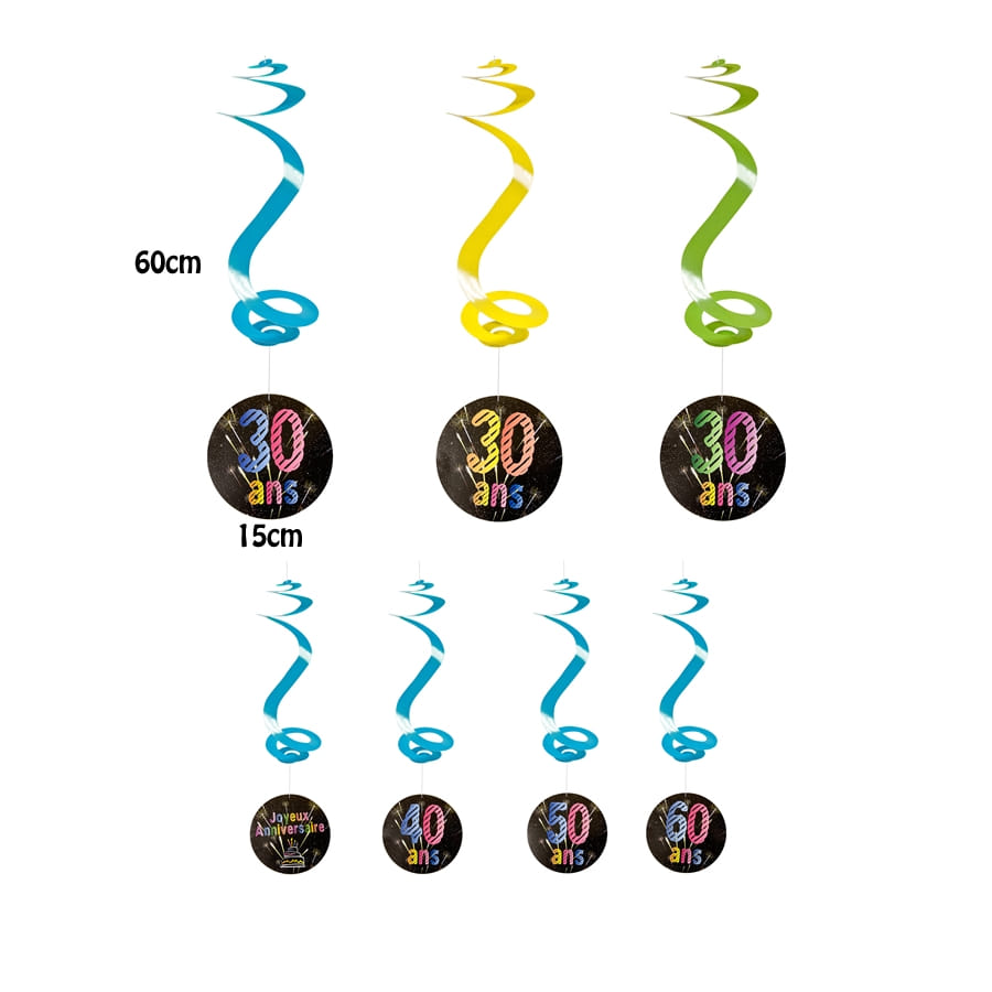 Les spirales peuvent être de différentes couleurs et sur chaque disque sont marquées des inscriptions au choix: 30 ans, 40 ans, 50 ans, 60 ans et joyeux anniversaire.