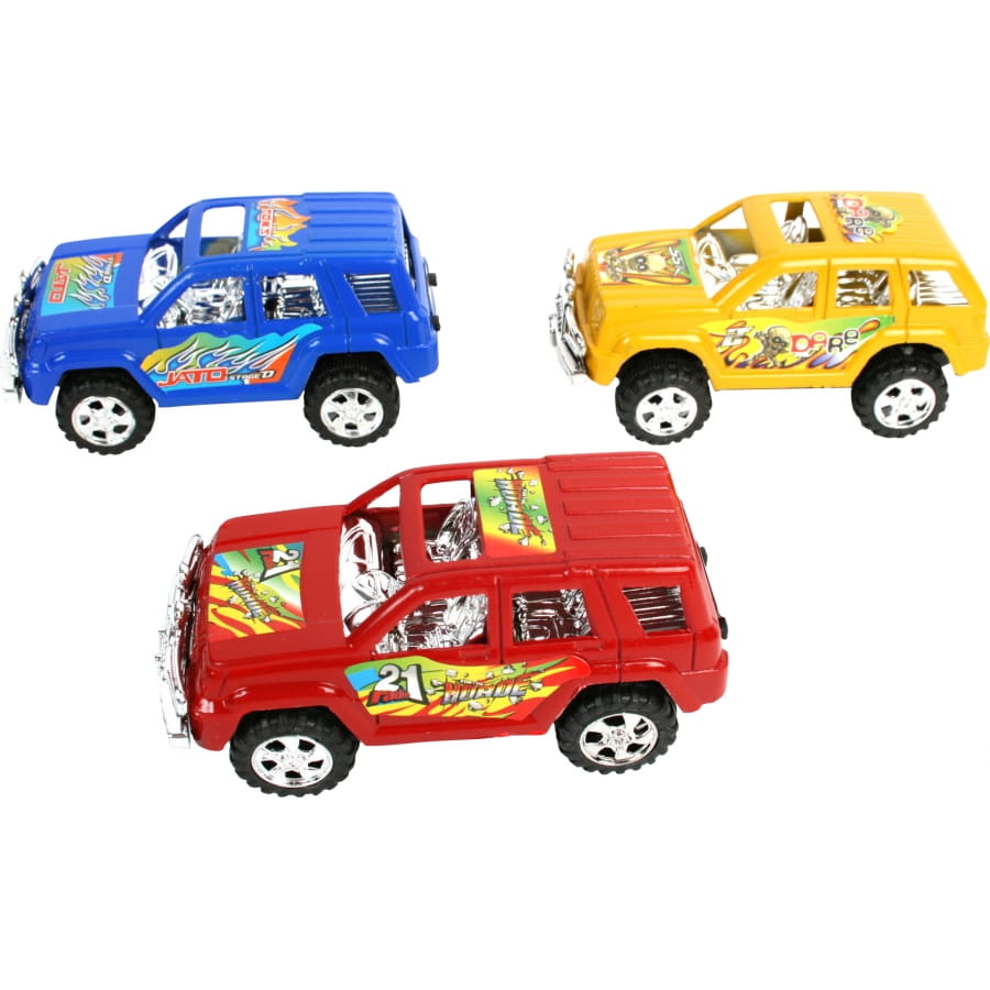 Véhicule 4x4 à rétro-friction, mesurant 10 centimètres. Lors de la commande, il vous sera impossible de choisir ni le modèle ni la couleur du véhicule. Vous recevrez le modèle en bleu, jaune ou rouge. Vos enfants adoreront ce jouet.
